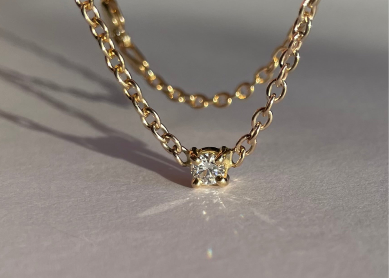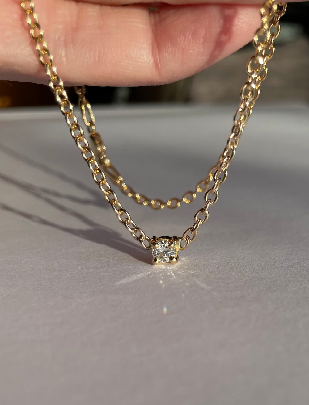 A stunning Gisèle necklace consists of a 40cm length round link chain 2.4mm wide, featuring a .25ct diamond ( 4mm round ) set in a modern four claw setting fixed into the chain.