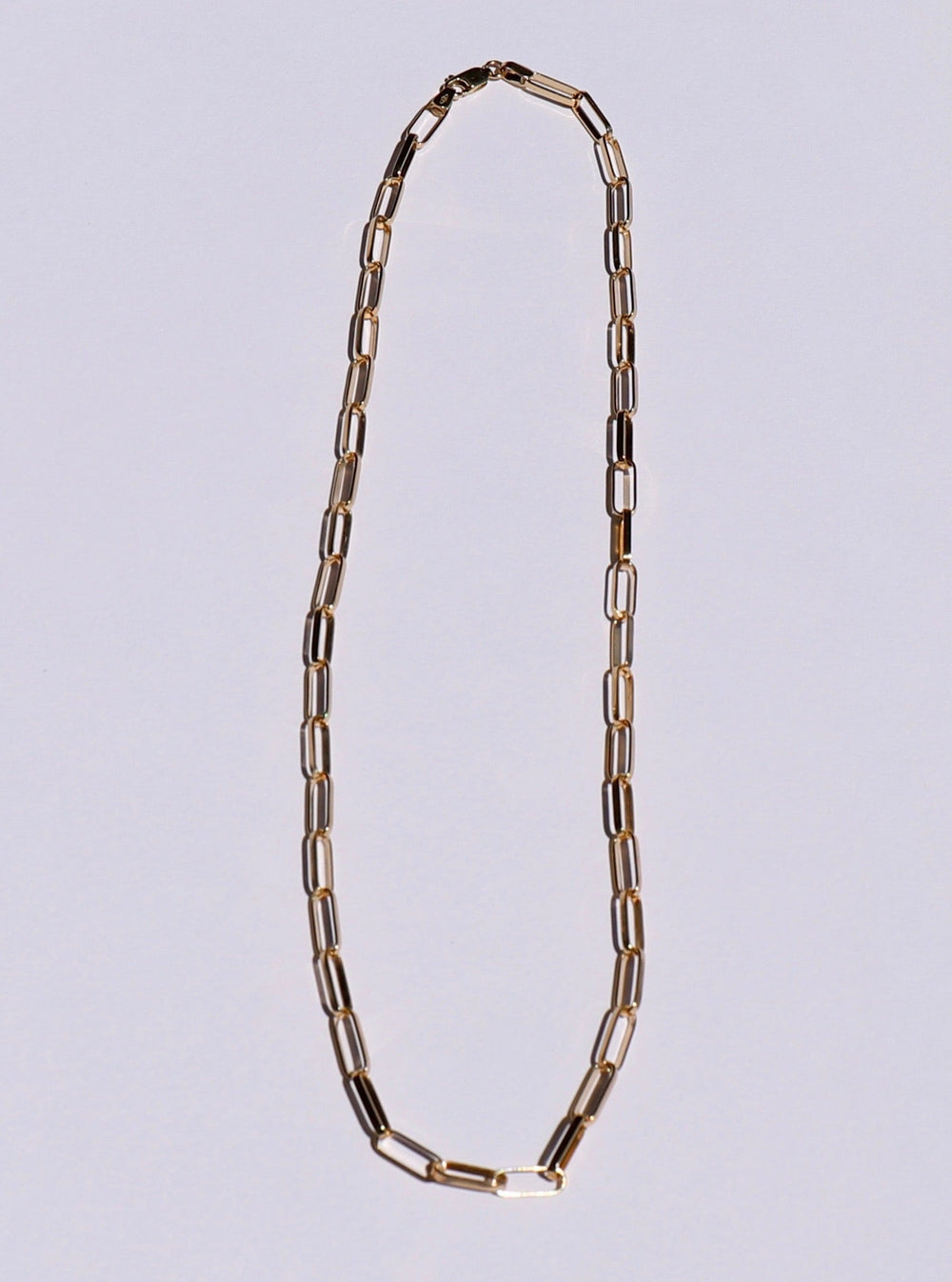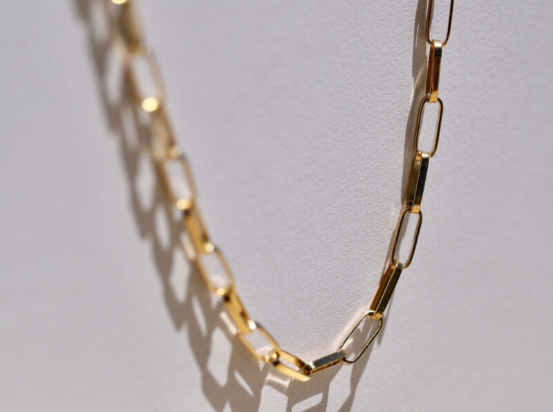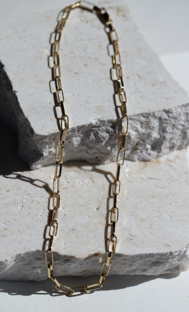 Our Paper-Clip Chain Necklace is crafted in solid gold with elongated rectangular links that strike a balance between strength and elegance. The 45cm length sits beautifully at the collarbone — perfect worn alone or layered with your favourite fine chains.