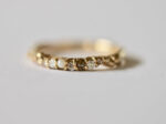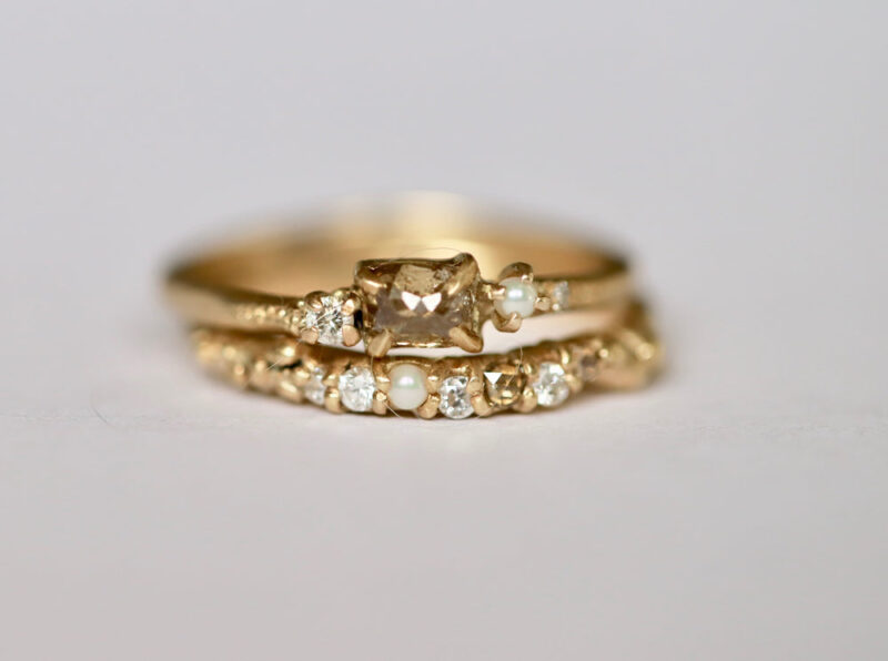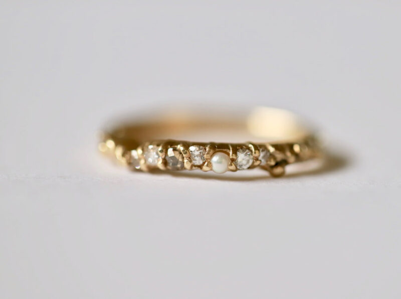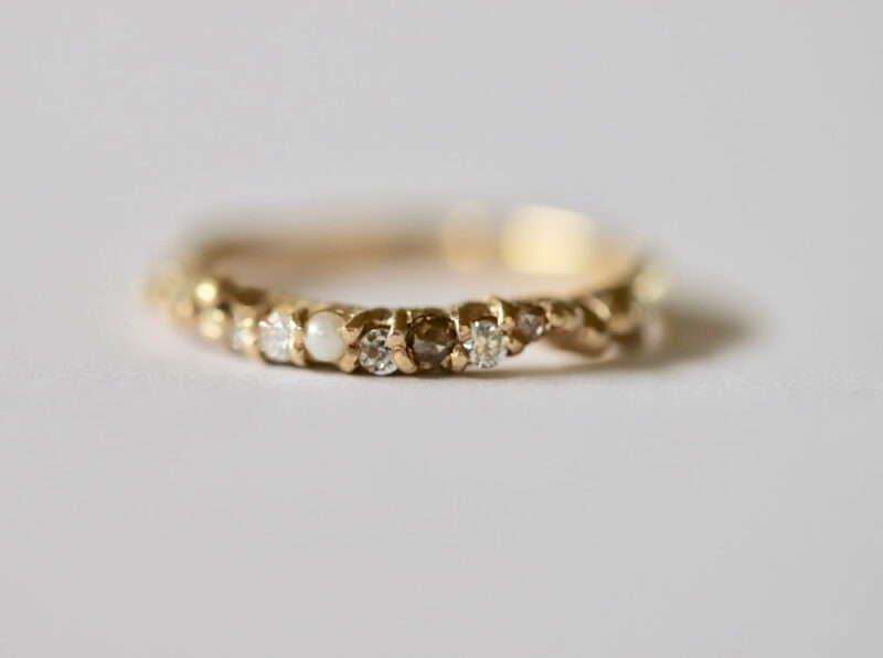 A delicate fusion of shimmer and softness, the Rozalia ring features a poetic mix of eight stones — including a 2mm round pearl, two rose cut champagne diamonds, and five white round diamonds — all claw set in a gentle, flowing rhythm.