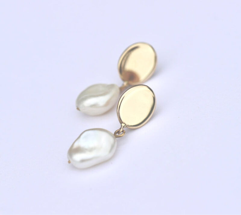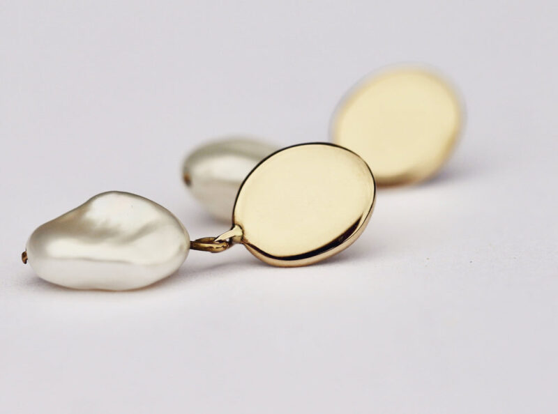 Graceful and sculptural, the Solene Earrings blend modern form with timeless beauty. A softly polished oval disc stud, 10mm in length, anchors a lustrous keshi pearl drop — each pearl approximately 8mm and uniquely organic in shape.