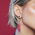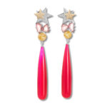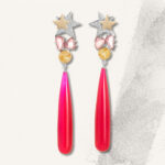 “Come as you are, as you were” – Kurt Cobain, Nirvana. There’s a lot going on with this set but it’s with meticulous design reasoning. These all-stars are crafted for women who walk the talk and don’t mind coming as they are to any occasion. Pavé set, diamond-encrusted silver stars with overlaid 18ct Yellow Gold stars sit atop the elaborate design; rose cut, pink garnets and yellow, rutilated quartz encased in 18ct yellow gold sparkle brilliantly below; and hot pink, chalcedony drops complete a jaw-dropping look that are totally rock star and our most elaborate creation by far.