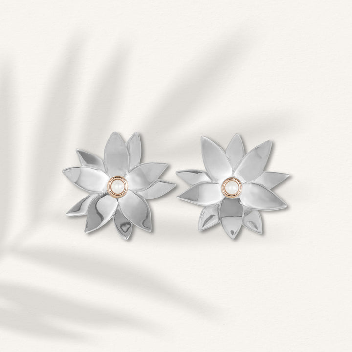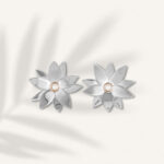 This intricate design is inspired by the iconic Daintree Rainforest in North Queensland. These earrings have been hand crafted in Sterling Silver to resemble the delicate petals of the flower. The blossoms surround a beautiful seed pearl that has been set in 9-carat rose gold. These earrings are an incredible statement piece that can be worn daily or reserved for special occasions.