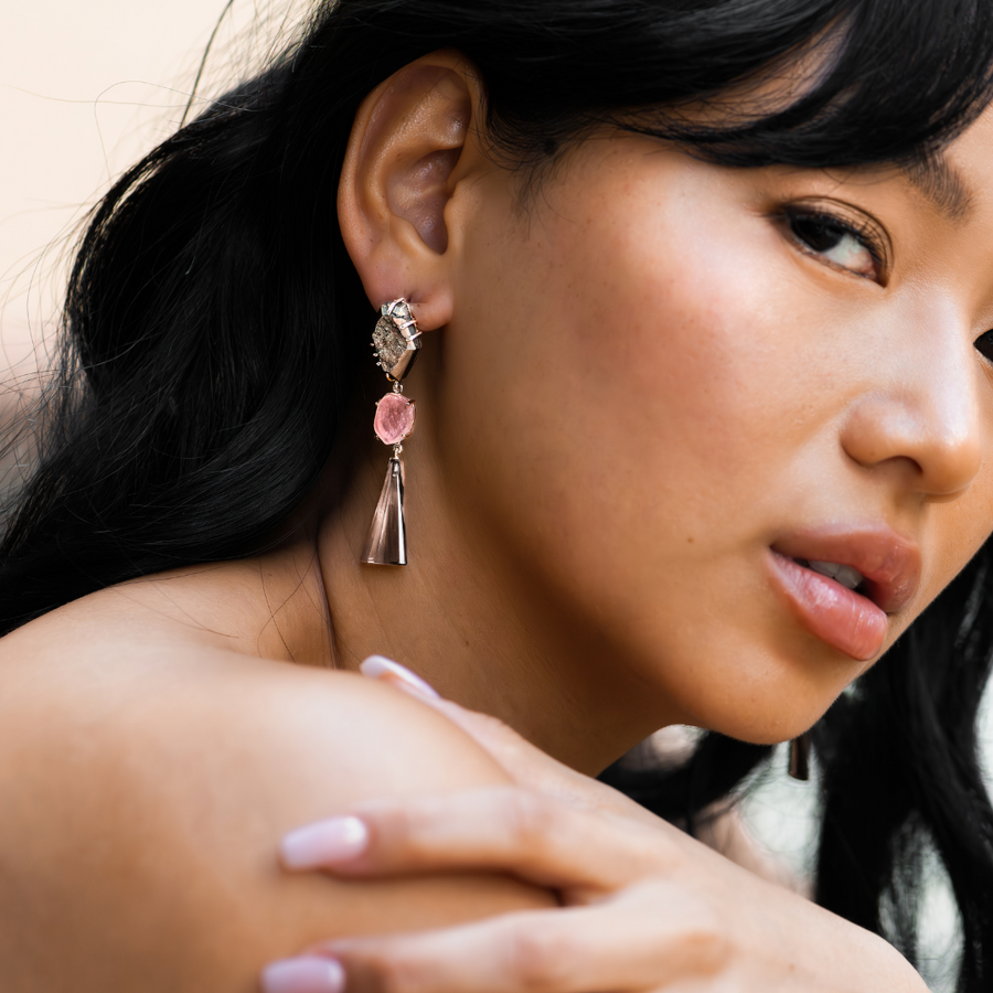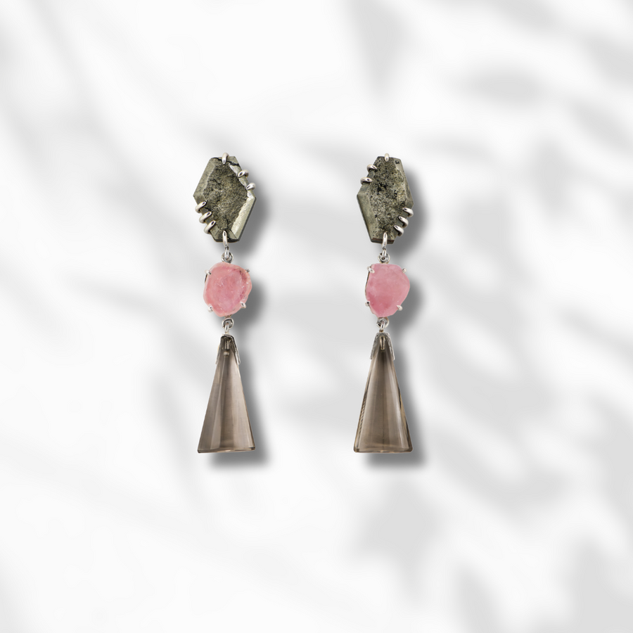A unique design of bespoke gemstones. Handmade in Sterling Silver with 9ct Yellow Gold detailing, this piece draws on an assortment of materials for added contrast and flare.