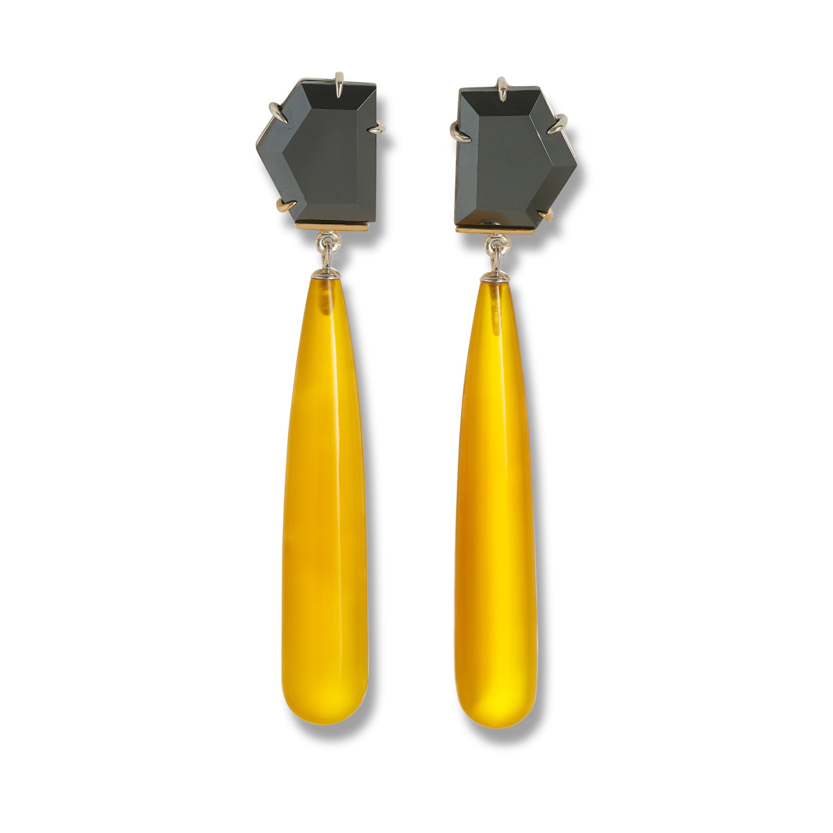 Take to the d-floor and twist those hips as your earrings swing in time to the feet tapping tunes of Chuck Berry. Perfect for a night out on the town, these elegant scene-stealers feature a Hematite accented by 18ct yellow gold with a yellow chalcedony drop creating a look that’s sure to complement all your best moves.