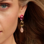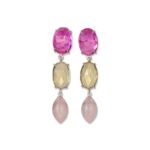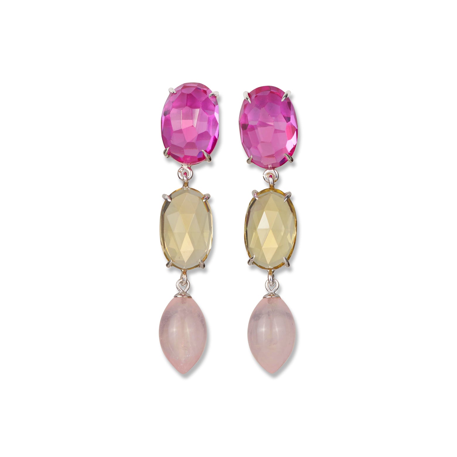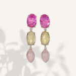 Enjoy the beautiful combination of soft sophistication and childlike wonder with these earrings inspired by everyone’s favourite lady of the sea, the Mermaid. Handcrafted from sterling silver, these earrings feature a trio of colourful gemstones inspired by the subtle beauty of a siren. With a brilliant pink stone, crystal lemon quartz and a soft rose quartz drop, this pair of earrings will glimmer with each step you take.
