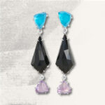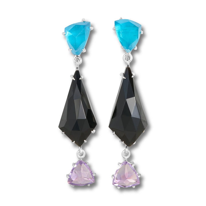 Let’s get this party started! A triple-tiered drop handmade to impress; it’s the juxtaposition of colour that sets off these eclectic earrings purposefully designed to stand out at any stylish celebration. Featuring neon blue apatite, black onyx and violet amethyst encased in 925 Sterling Silver, these intriguing beauties are destined to make you the life of the party.