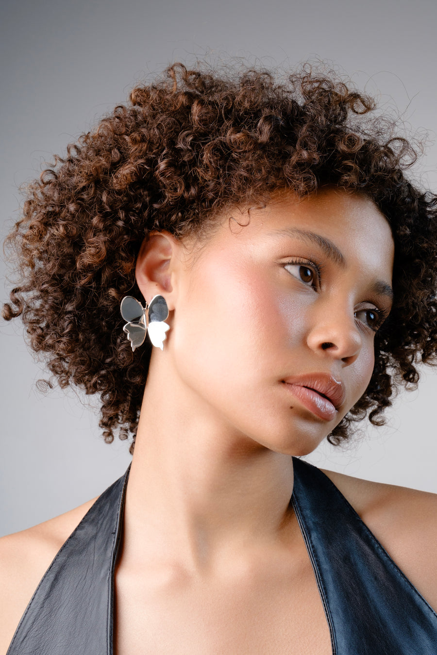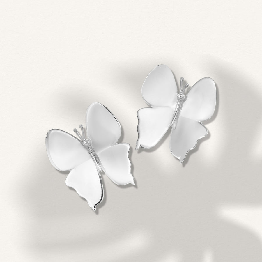 These beautiful statement earrings have been hand cast in Sterling Silver. The silver has been delicately crafted into the shape of a butterfly, a symbol of beauty and metamorphosis. The intricate placement of the posts allows these earrings to capture light from many angles, giving these delicate wings the illusion of movement. They are a sure way to complete any ensemble, no matter the occasion.