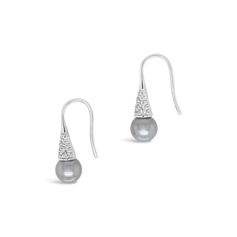 Sterling Silver cone shepherd hook earrings featuring cubic zirconias and 7.6mm Abrolhos Island Pearl.