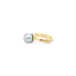 9ct yellow gold Latitude signature twist ring featuring 8mm Abrolhos Island Black Pearl with Latitude inscription on the side.