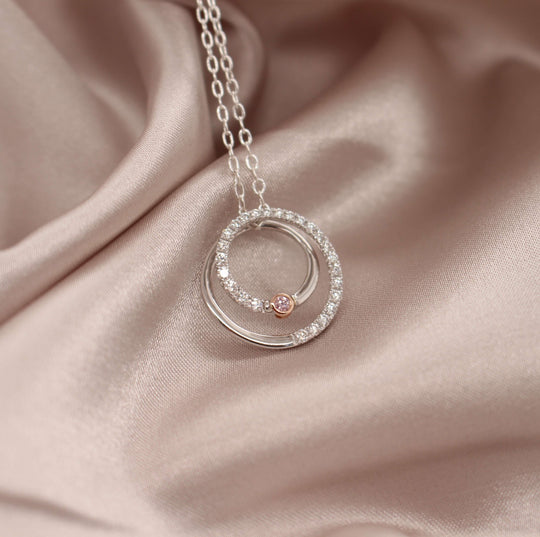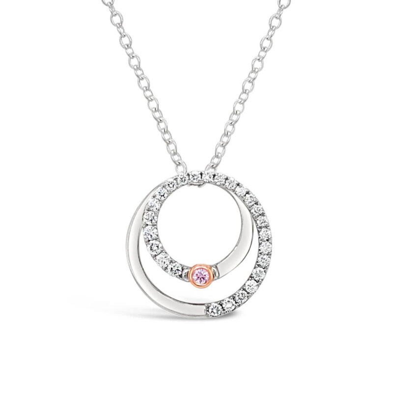 Our ‘Pink and White Diamond Circle Pendant’, a standout piece in our Pink Diamond Collection. This pendant, crafted in white gold, showcases a unique swirl design with double circles. One half of the swirl features a dazzling diamond eternity design, adding a touch of timeless glamour.