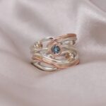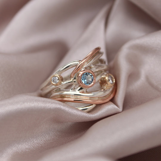 Introducing our beloved Bella Ring, now reimagined with a captivating touch of elegance. This stunning piece features a Aquamarine at its centre, set in Rose Gold and beautifully complemented by two brilliant White Diamonds set in Yellow Gold.