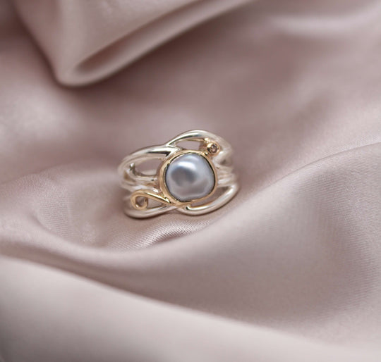 Crafted in Sterling Silver, the Bella Ring highlights one of our very own home-grown Abrolhos Island Keshi Pearls, hand-selected by our founder, Pia Boschetti, for its unique organic shape. To enhance its elegance, the Keshi Pearl is paired with a delicate 9ct Yellow Gold swirl decoration and a Champagne Diamond.