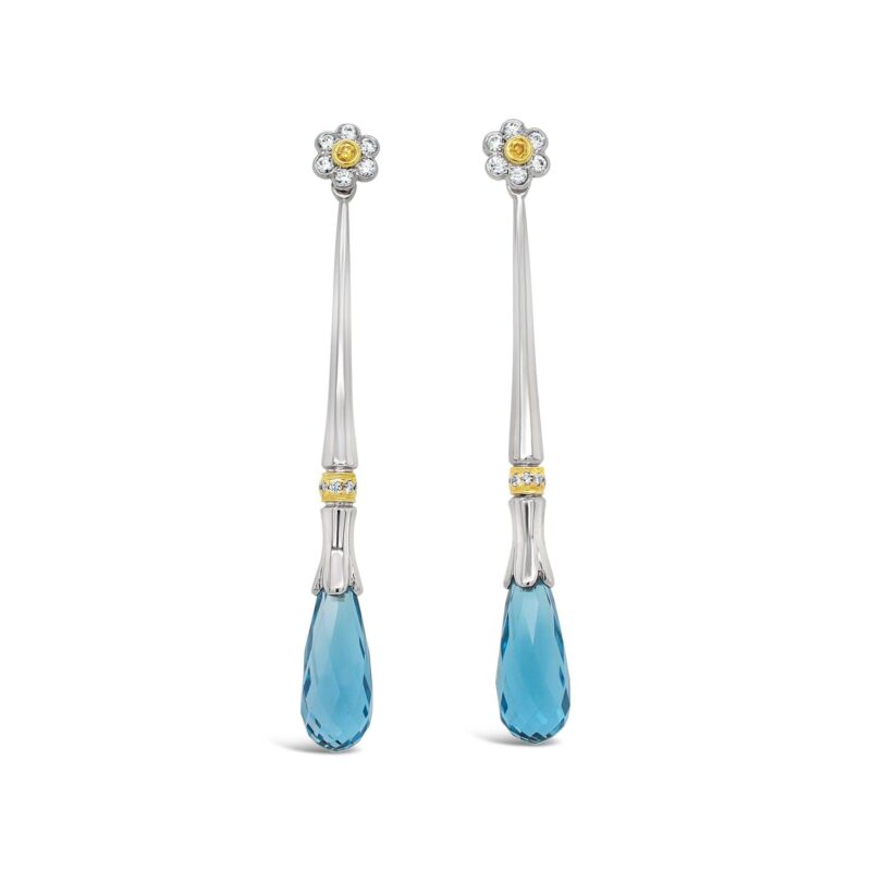 Inspired by the breathtaking beauty of golden sunsets meeting the endless blue horizon, the Golden Horizon Earrings are a celebration of elegance and timeless design. Featuring two stunning Topaz Briolette gemstones with a combined weight of 18.7 carats, these earrings radiate brilliance and sophistication.