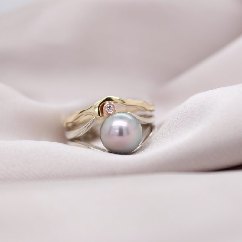 Introducing our beloved Wave Ring, now reimagined with a captivating touch of elegance. This stunning piece features one of our home-grown Abrolhos Island Black Pearls, beautifully complemented by an exquisite Pink Diamonds from the renowned Argyle Mine.