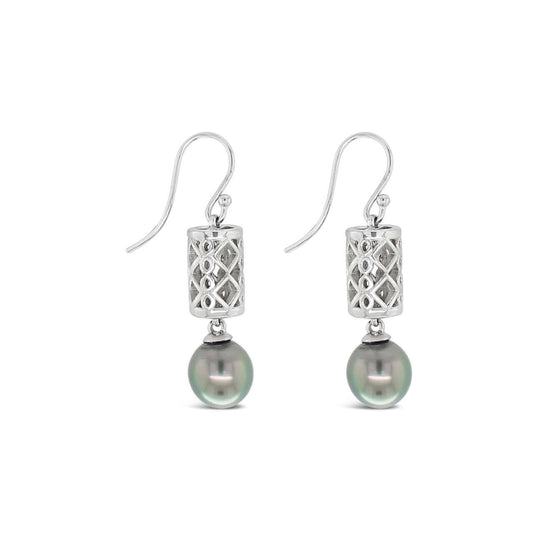 Take a journey to another world with these Moroccan-inspired earrings. Pia designed the Moroccan Collection, drawing inspiration from her many travels abroad. The repetitive geometric patterns are in perfe carat harmony with our home-grown Abrolhos Island Pearls. These modern and elegant earrings are paired with two of our home-grown Abrolhos Black Pearls from the Abrolhos Islands. Available in 9 carat Yellow Gold and 9 carat White Gold.