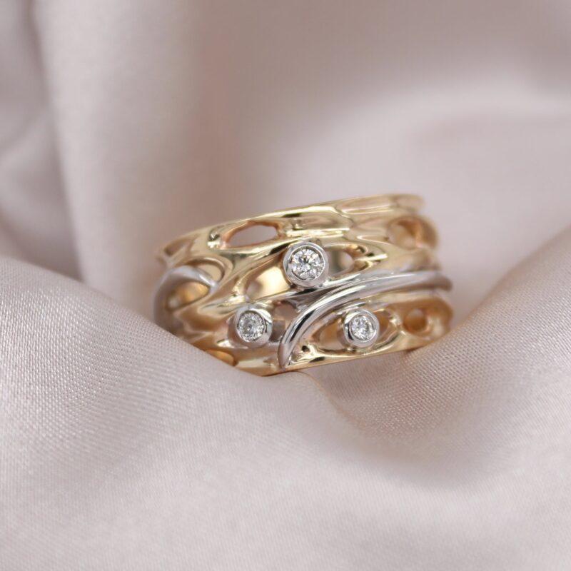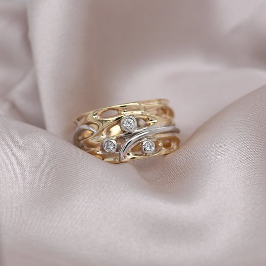 The combination of yellow gold, white gold, and diamonds create a harmonious blend of elegance and luxury, making this ring a versatile and timeless addition to your jewellery collection. Embrace the tranquility of the Oily Calm Collection and experience the serenity of nature’s beauty in every wearing.