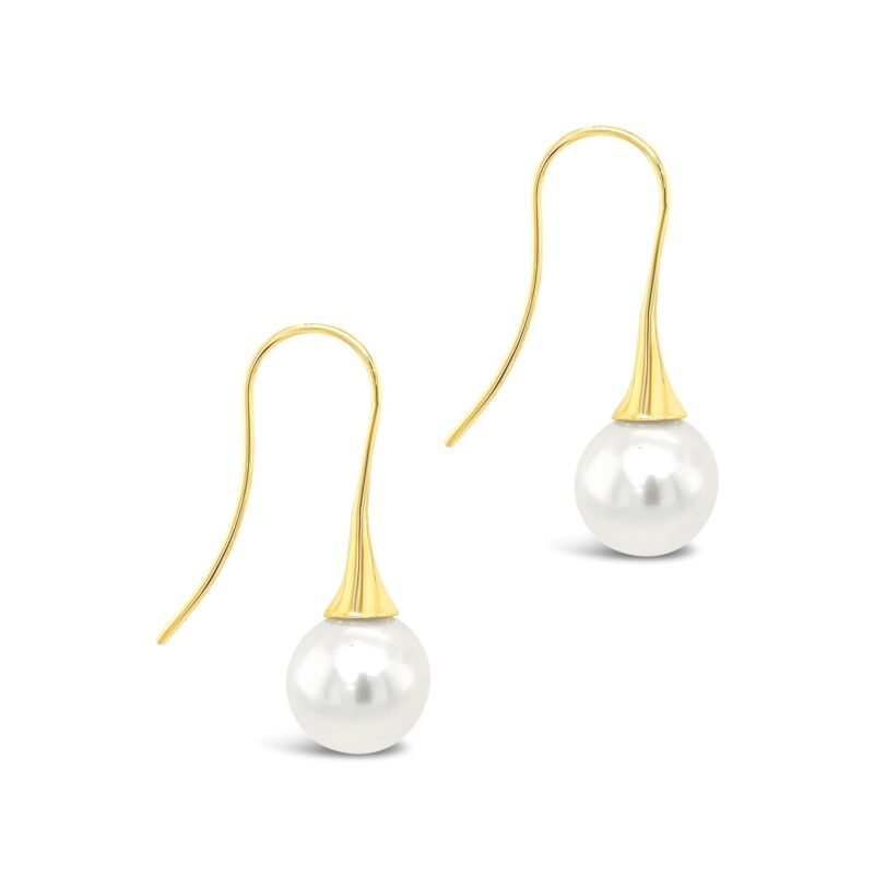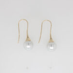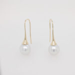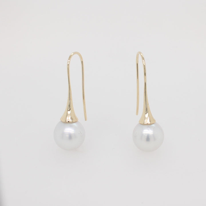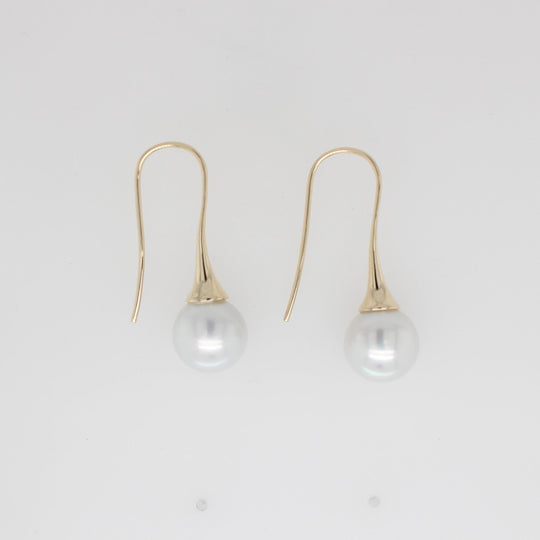 9 carat yellow gold shepherd hook earrings featuring 10mm Australian South Sea Pearls.