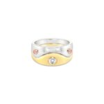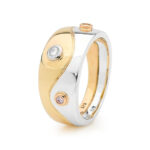 Celebrate the beauty of togetherness with our “Unity” Ring, a stunning symbol of the union between two people. This wide gold band features an intricate wave pattern crafted from both yellow and white gold. Where the waves meet, they perfectly cradle three exquisite diamonds, symbolising the harmony and unity of two lives coming together.