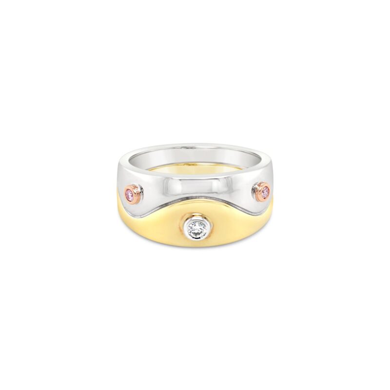 The yellow gold section of the band features a brilliant white diamond bezel set in white gold, while the white gold wave is adorned with two rare Australian Pink Diamonds. The mix of yellow, white, and rose gold metals creates a beautiful contrast, giving this ring a contemporary and unique design.