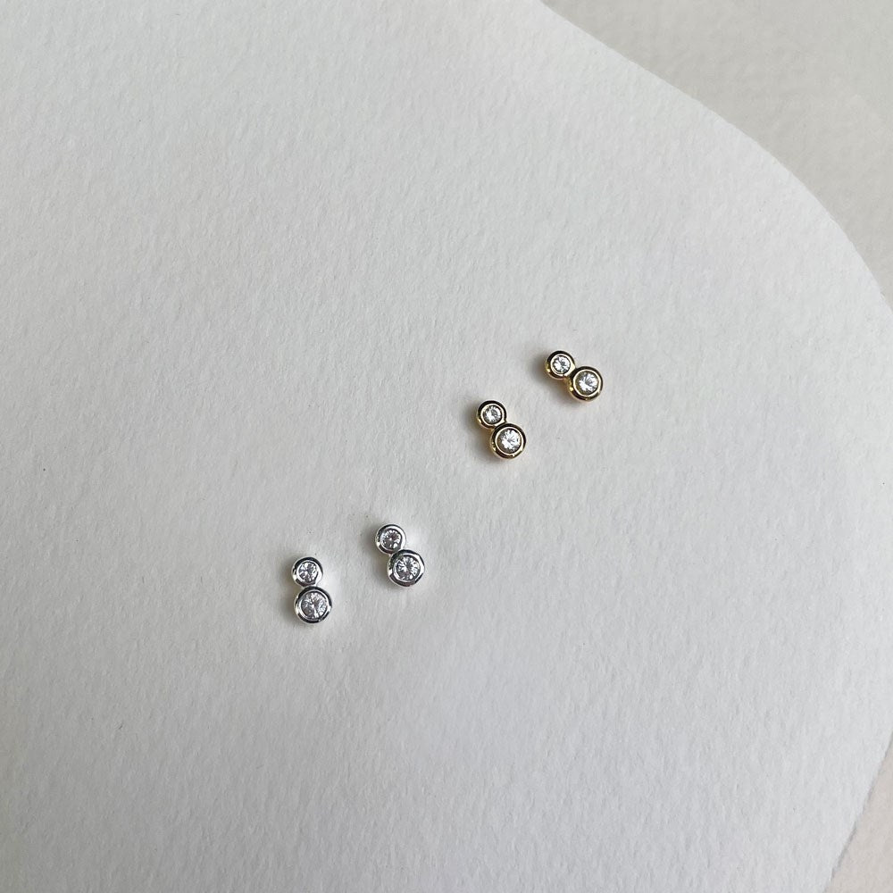 Our Duo Stud Earrings feature natural white topaz stones, bezel set.