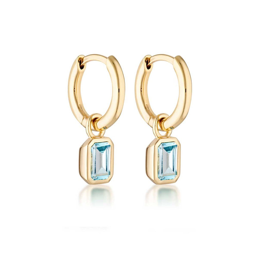 Our Classic Huggie Earrings featuring our Gemme Blue Topaz charms. Wear them with the charm, or remove the charms to wear as a stand-alone huggie earring style.