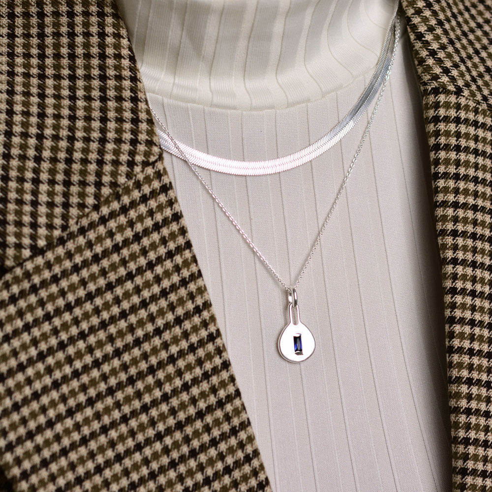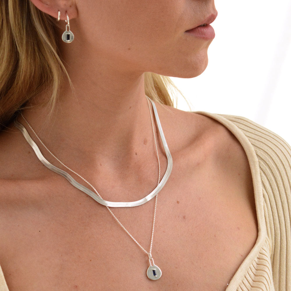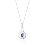 Sapphire, set into a polished pendant. We love the simplicity of this necklace and the beauty of the Sapphire. Blue sapphires are symbolic of the heavens, with properties of clarity, healing and protection.