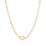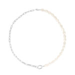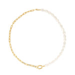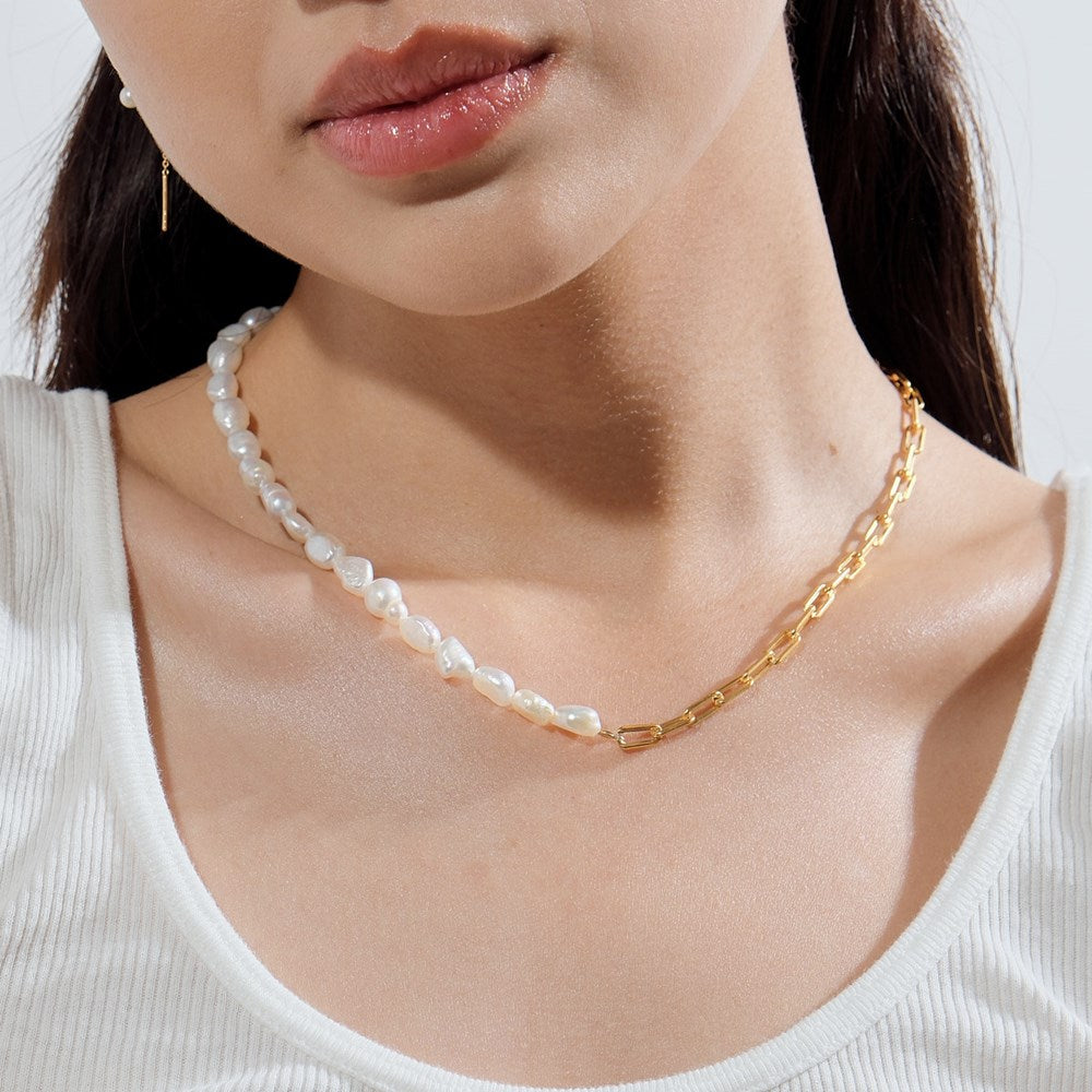 A half-half necklace featuring a paperclip link chain and baroque freshwater pearls. The pearls are natural baroque pearls and therefore shape varies from pearl to pearl. The necklace features an oval shaped push clasp, which can be worn to the front as a feature or the back.