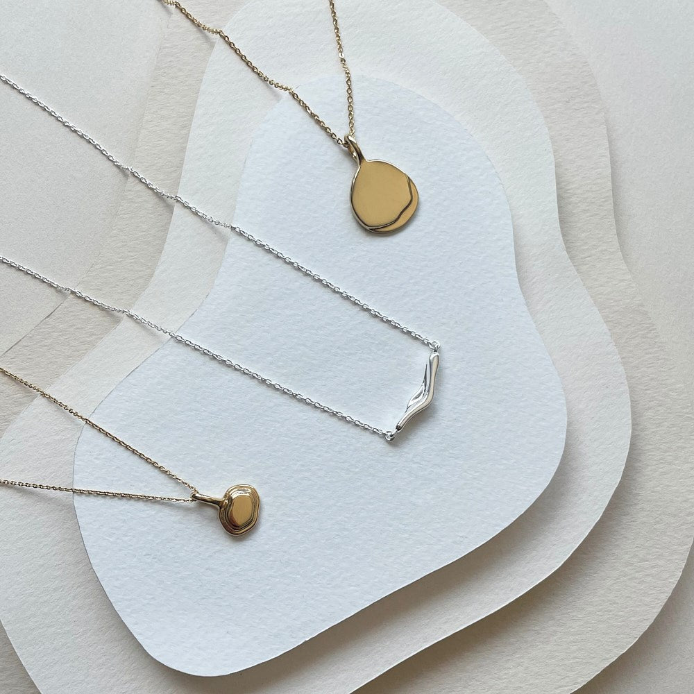 An organic shaped bar pendant suspended on a chain. Finished with a high polished finish, we love this as a layering piece.