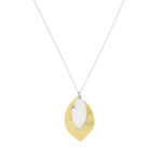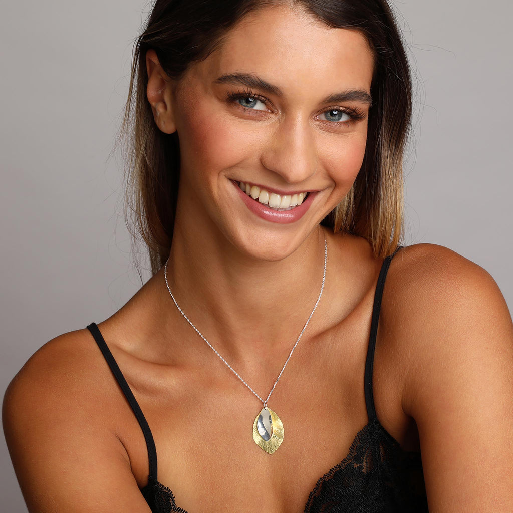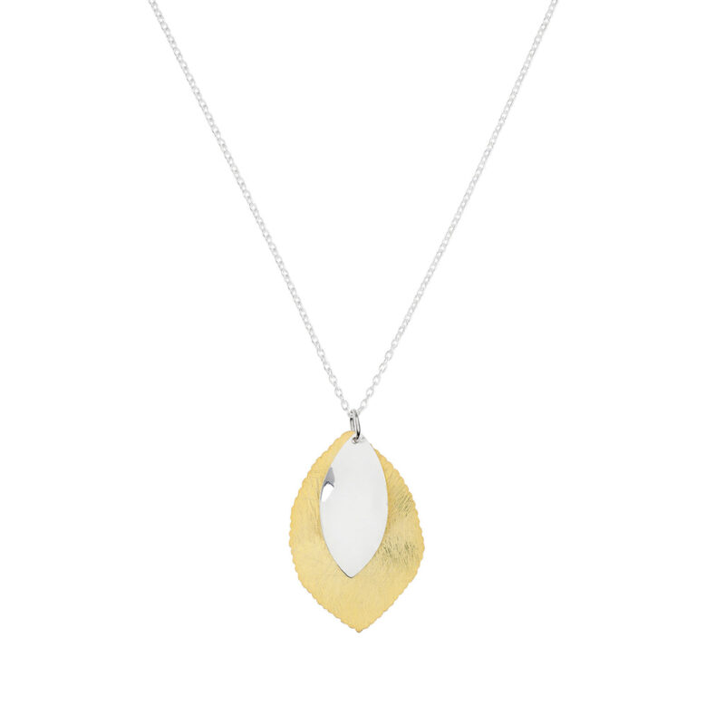 Wear sheer elegance around your neck with this beautiful two toned pendant – hand-crafted with sterling silver and 18K gold. Wraps around your neck stunningly with a sterling silver cable chain. Inspired by the delicate shape of leaves.