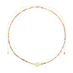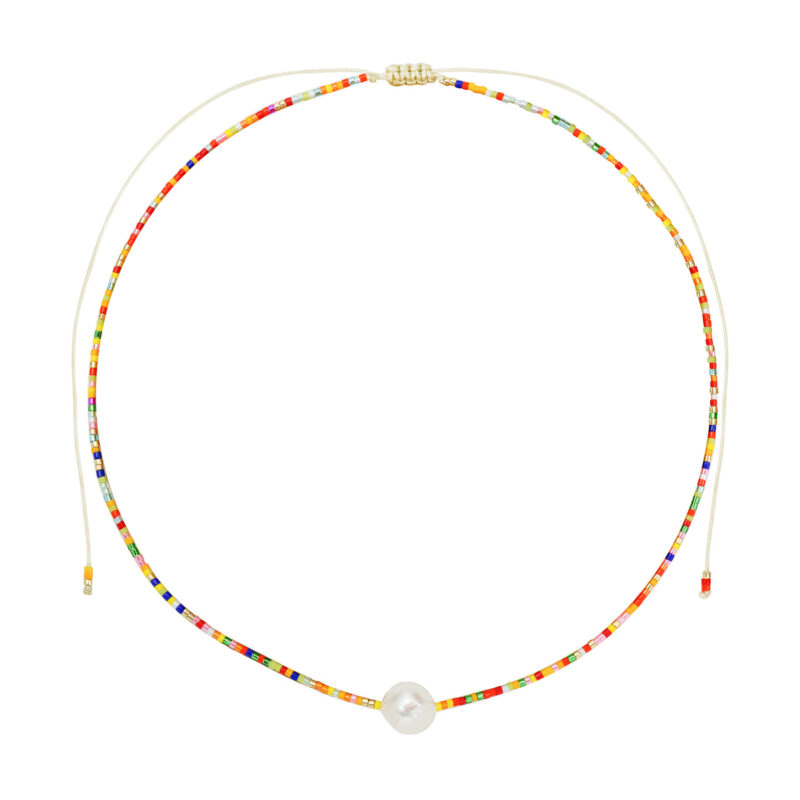 This choker features a large baroque freshwater pearl between bright rainbow and gold Japanese seed beads. The adjustable string makes it perfect for layering with your other favourite chains or wear it as a stand alone piece. Tarnish resistant and safe on sensitive skin.