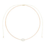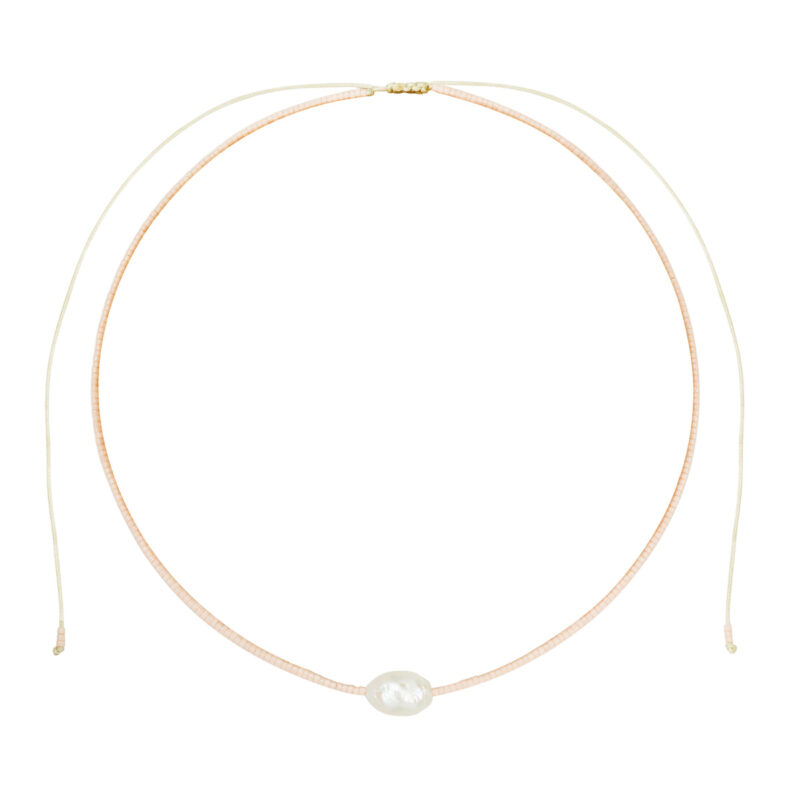 This choker features a large baroque freshwater pearl between light pink Japanese seed beads. The adjustable string makes it perfect for layering with your other favourite chains or wear it as a stand alone piece. Tarnish resistant and safe on sensitive skin.