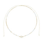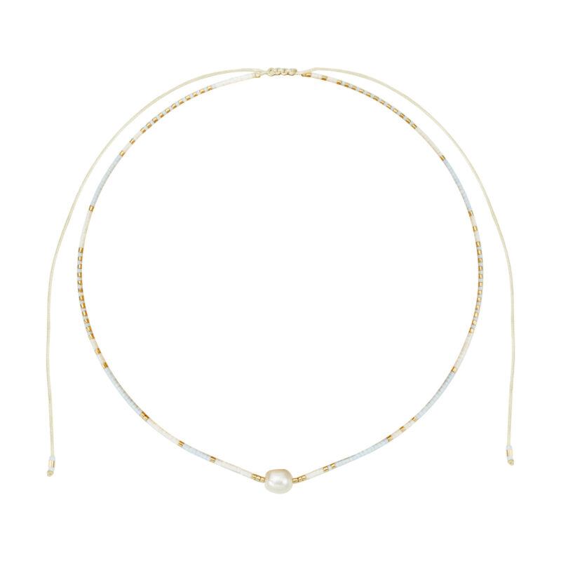 This choker features a baroque freshwater pearl between powder blue, white & gold Japanese seed beads. The adjustable string makes it perfect for layering with your other favourite chains or wear it as a stand alone piece. Tarnish resistant and safe on sensitive skin.