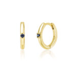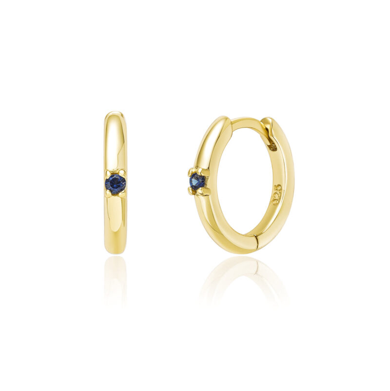 The September Birthstone Hoops are a mini golden style hoop adorned with a single round sapphire cubic zirconia stone, for that added personal touch. Tarnish resistant and safe on sensitive skin.