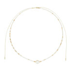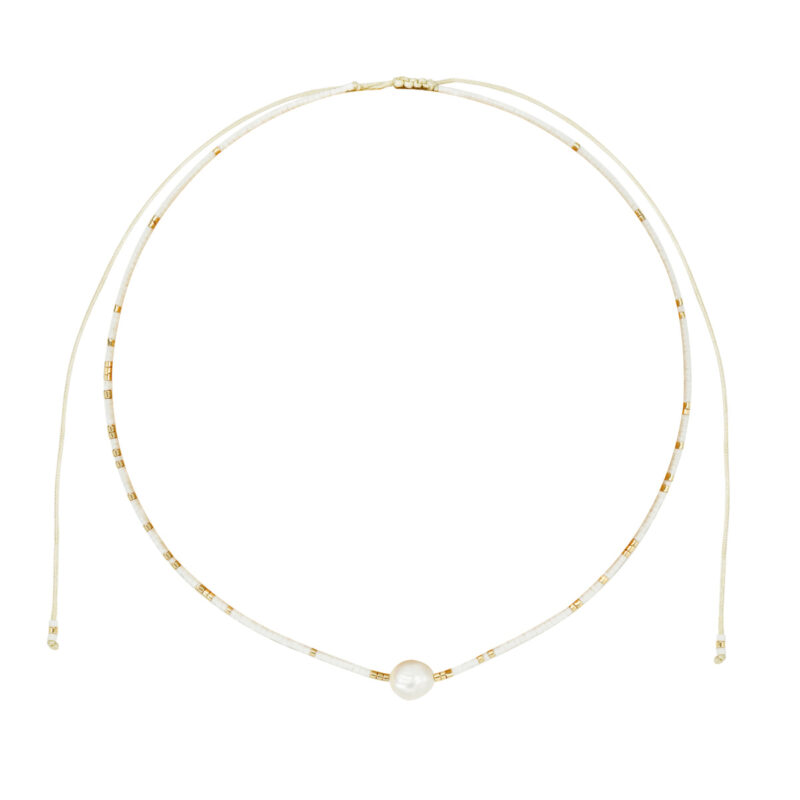 This choker features a baroque freshwater pearl between white and gold Japanese seed beads. The adjustable string makes it perfect for layering with your other favourite chains or wear it as a stand alone piece. Tarnish resistant and safe on sensitive skin.