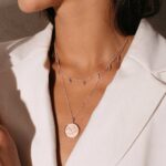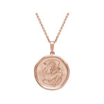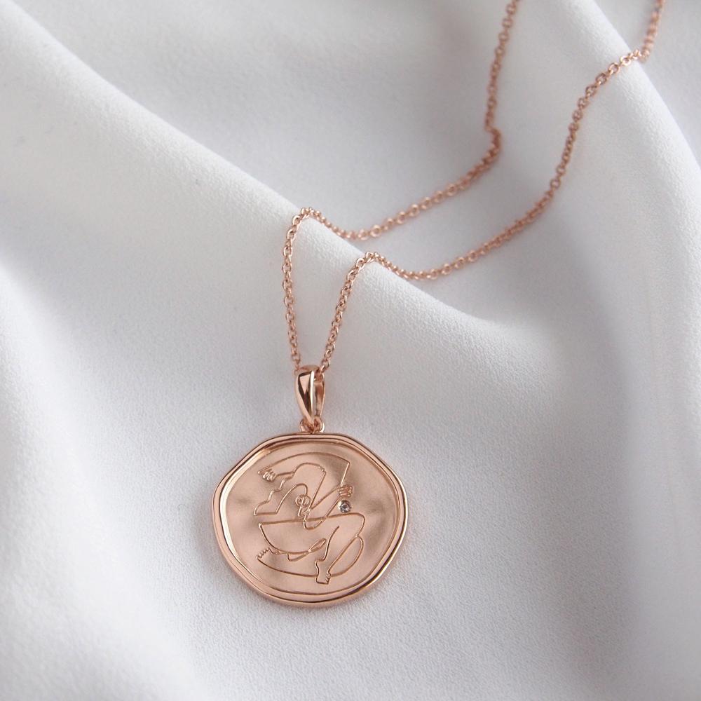 Rose Gold Coin Necklace with etched Empowerment drawing on pendant, featuring White Topaz.
