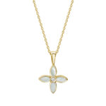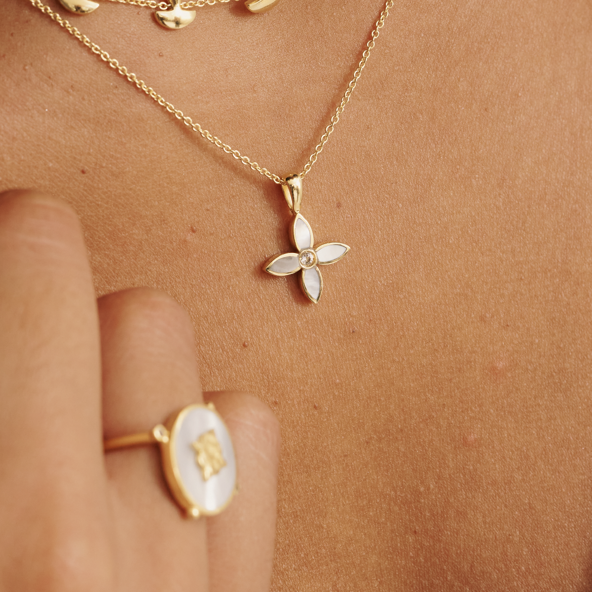 Floral pendant necklace with Mother of Pearl and White Topaz details.