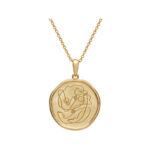 Yellow Gold Coin Necklace with etched Motherhood drawing on pendant.