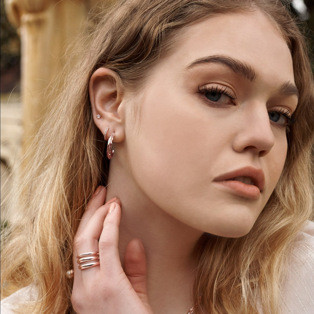 An artistic interpretation of an iconic wave like golden brooch, the new Vintage Abstract collection has taken the 1980’s abstract design and made it more textural and contemporary for wearing now. The use of a full shine metal finish and pearls creates a connection with the ocean and our modern world. Featuring an undulating and playful surface, the collection is romantic and whimsical, featuring Hoop and Hanging Statement earrings as well as a FOB Chain necklace and Stacking ring.