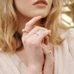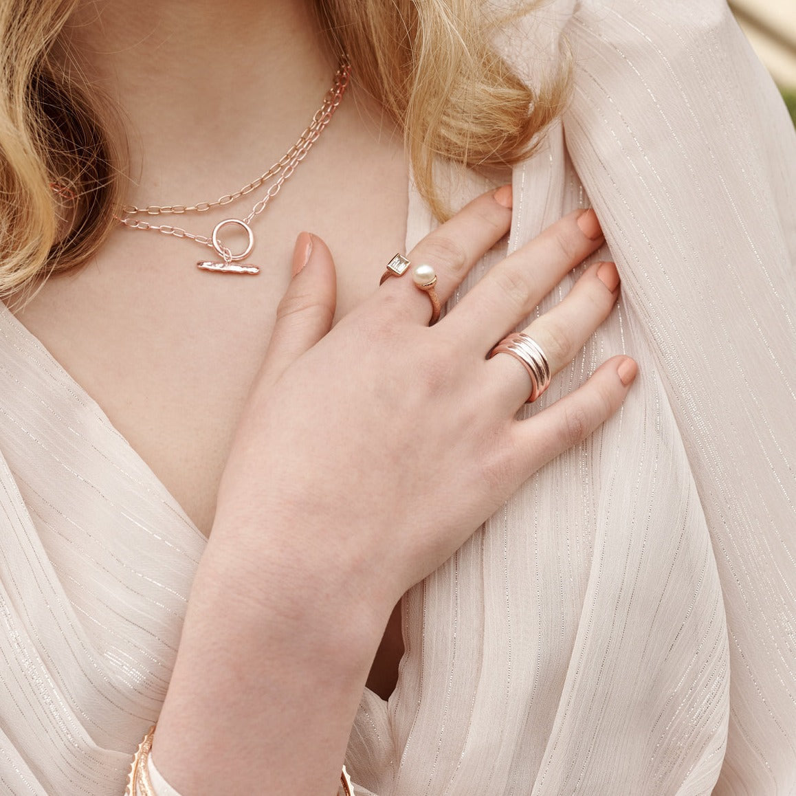 An artistic interpretation of an iconic wave like golden brooch, the new Vintage Abstract collection has taken the 1980’s abstract design and made it more textural and contemporary for wearing now. The use of a full shine metal finish and pearls creates a connection with the ocean and our modern world. Featuring an undulating and playful surface, the collection is romantic and whimsical, featuring Hoop and Hanging Statement earrings as well as a FOB Chain necklace and Stacking ring.