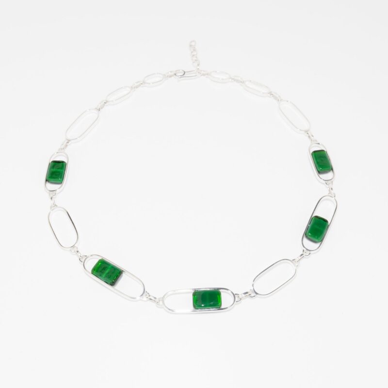 Decadence personified. This statement necklace features handmade glass jewels that float in architecturally inspired links for a fashion forward aesthetic that turns heads.