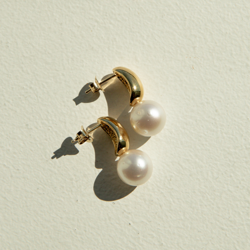 These modern Ebb Pearl Stud Earrings feature a pair of 11mm Near Round B2 grade Cygnet Bay (WA) grown Australian South Sea pearls set in sterling silver and gold vermeil.