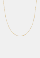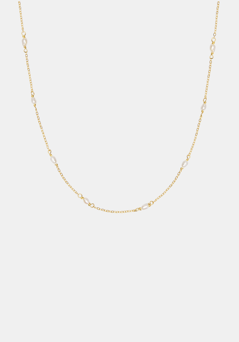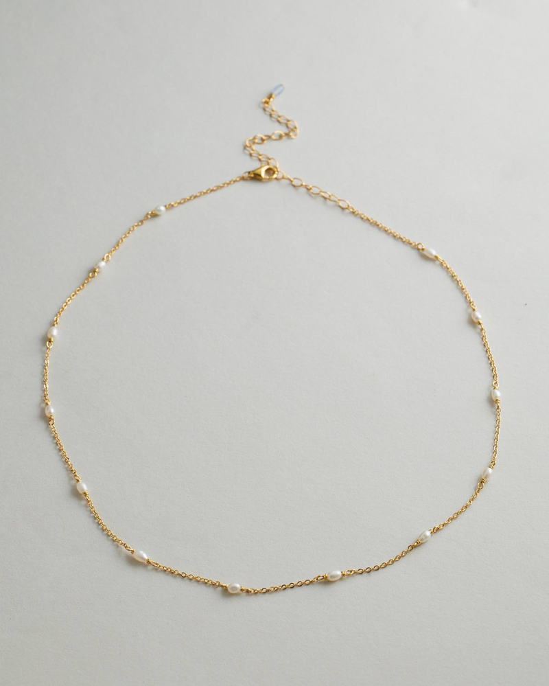 Featuring the natural beauty of petite freshwater pearls suspended on a fine chain, with the subtle addition of a single blue stone imbued with sentimentality and good luck.