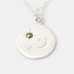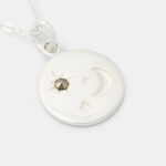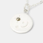The moon & stars pendant is made in shiny sterling silver. Sitting off-centre at the heart of one of the stars is a little facetted marcasite gemstone, an old fashioned gemstone which adds some sparkle in a muted gold tone.