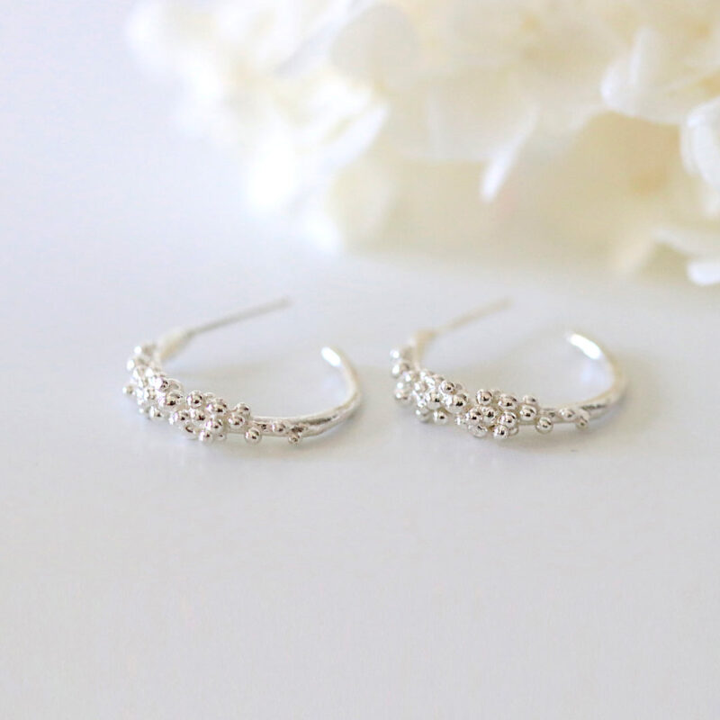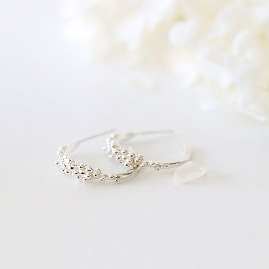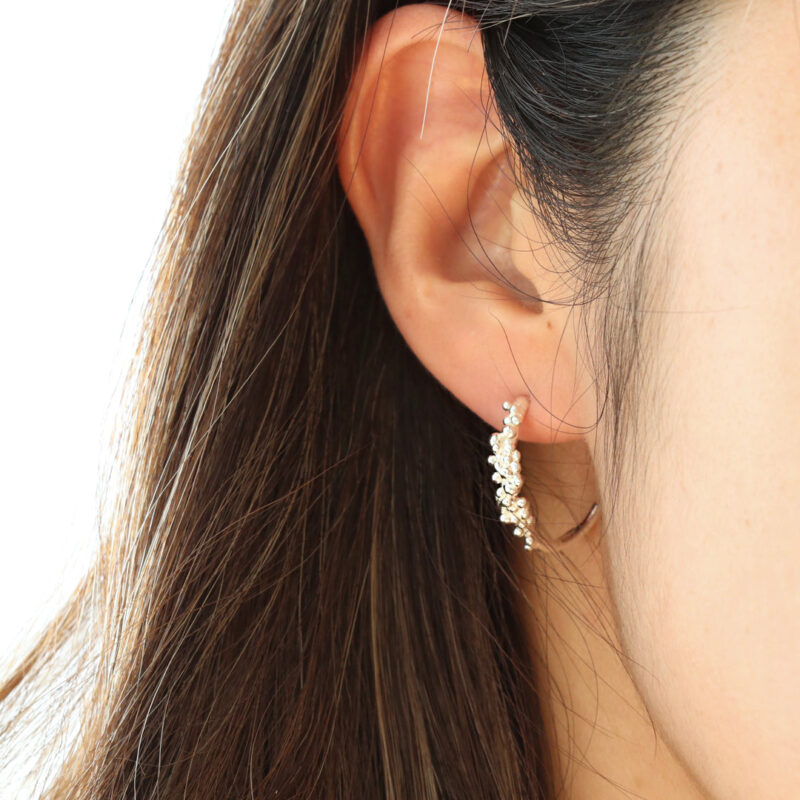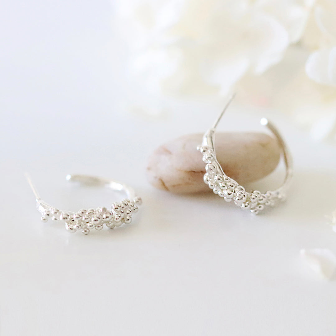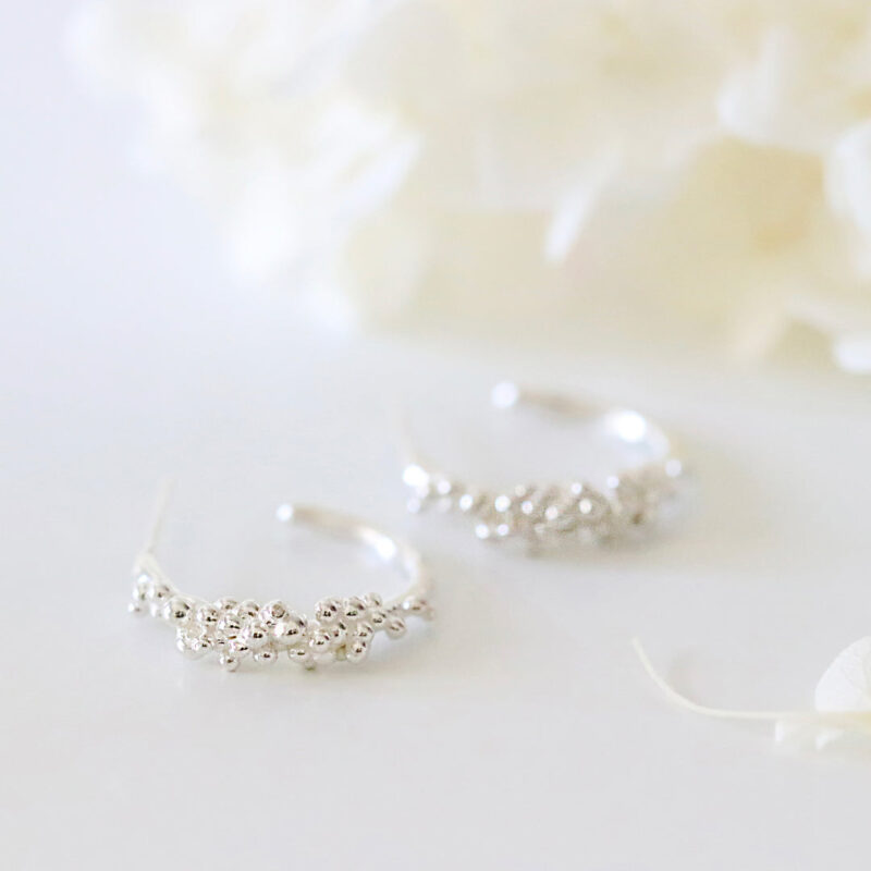 These exquisite earrings are handmade with high-quality sterling silver and feature a unique design inspired by bubbles. Each earring showcases an array of small, silver bubble-like beads, creating an organic and textured look that captures the whimsical beauty of bubbles.