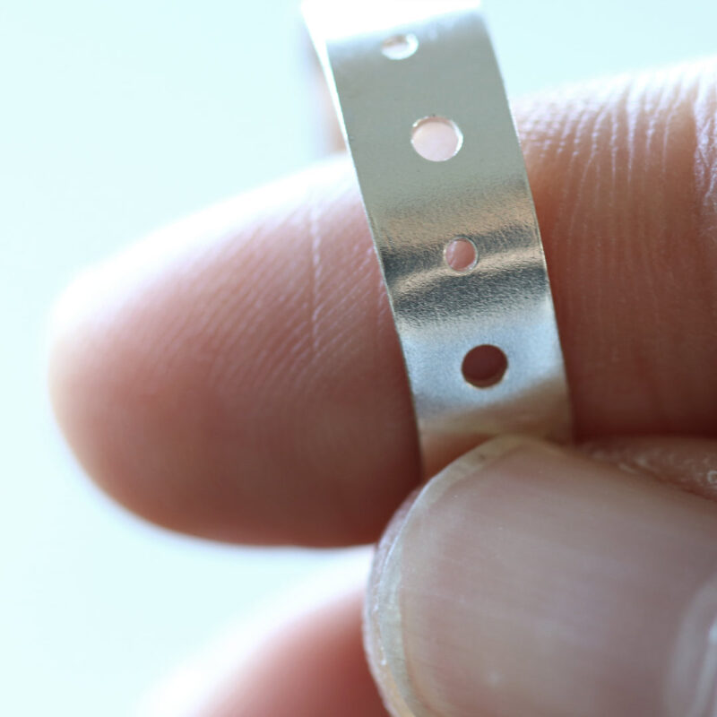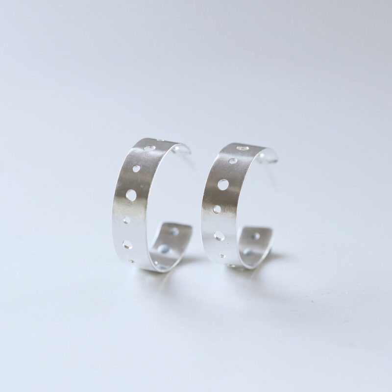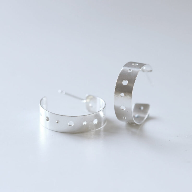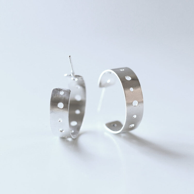 These modern hoops feature a playful pattern of cut-out dots, offering a fresh and contemporary twist on a classic design. Lightweight and versatile, they’re perfect for everyday wear or a subtle statement look.
