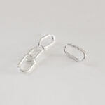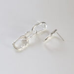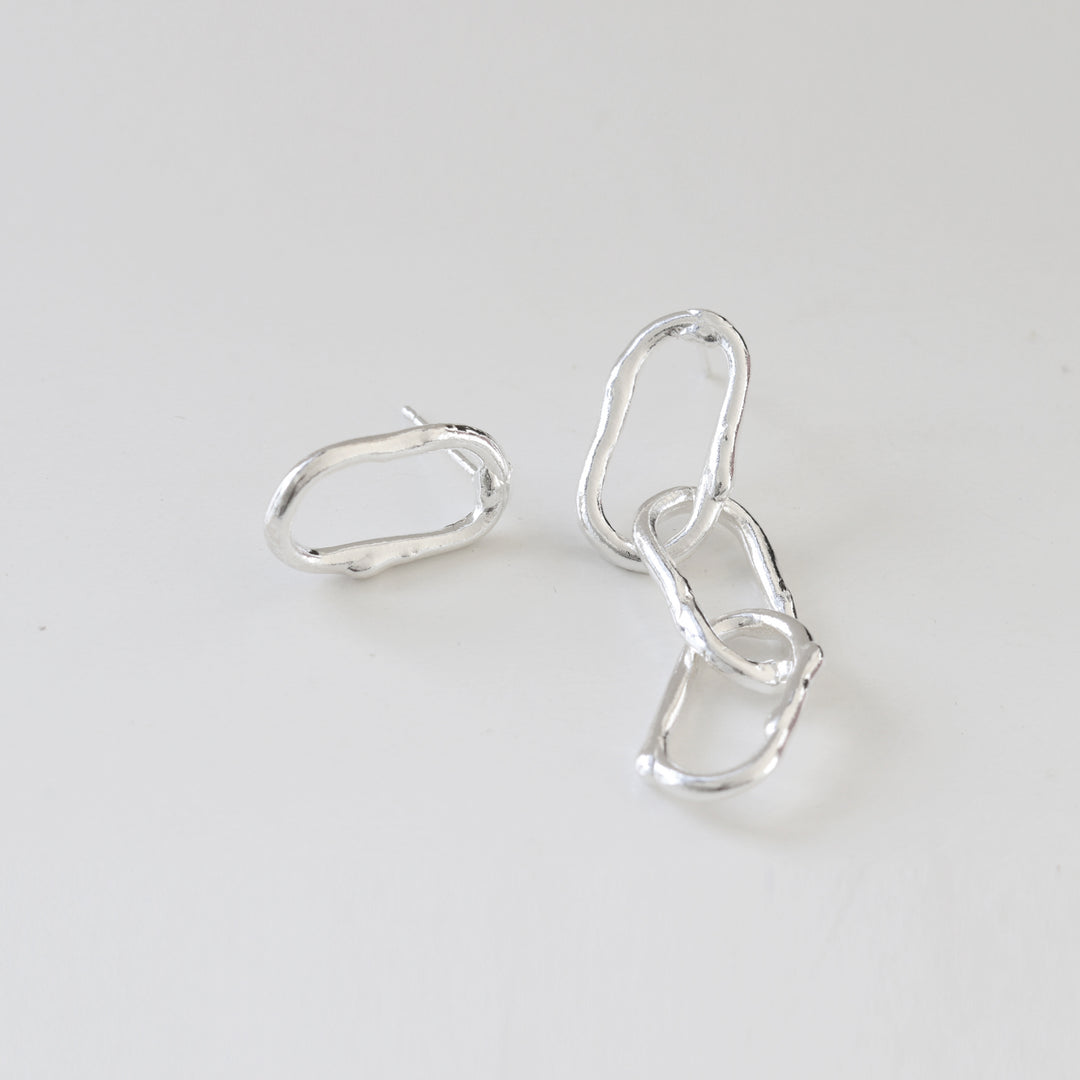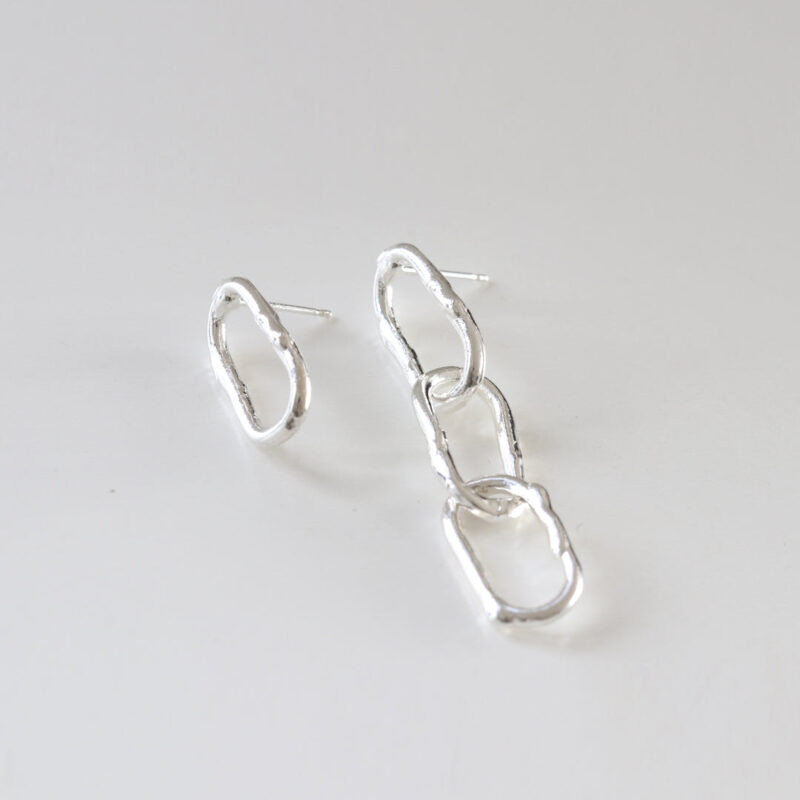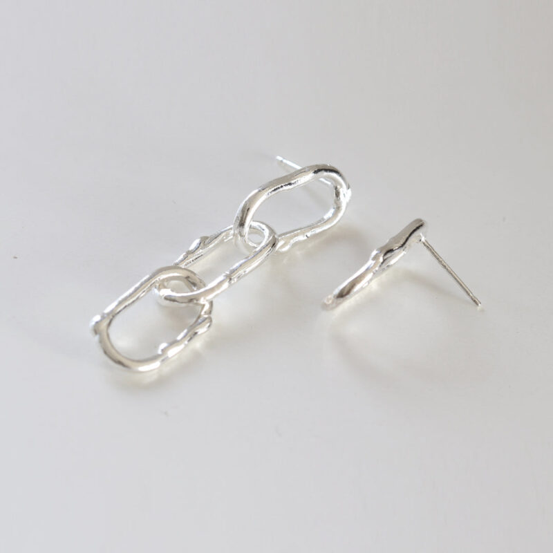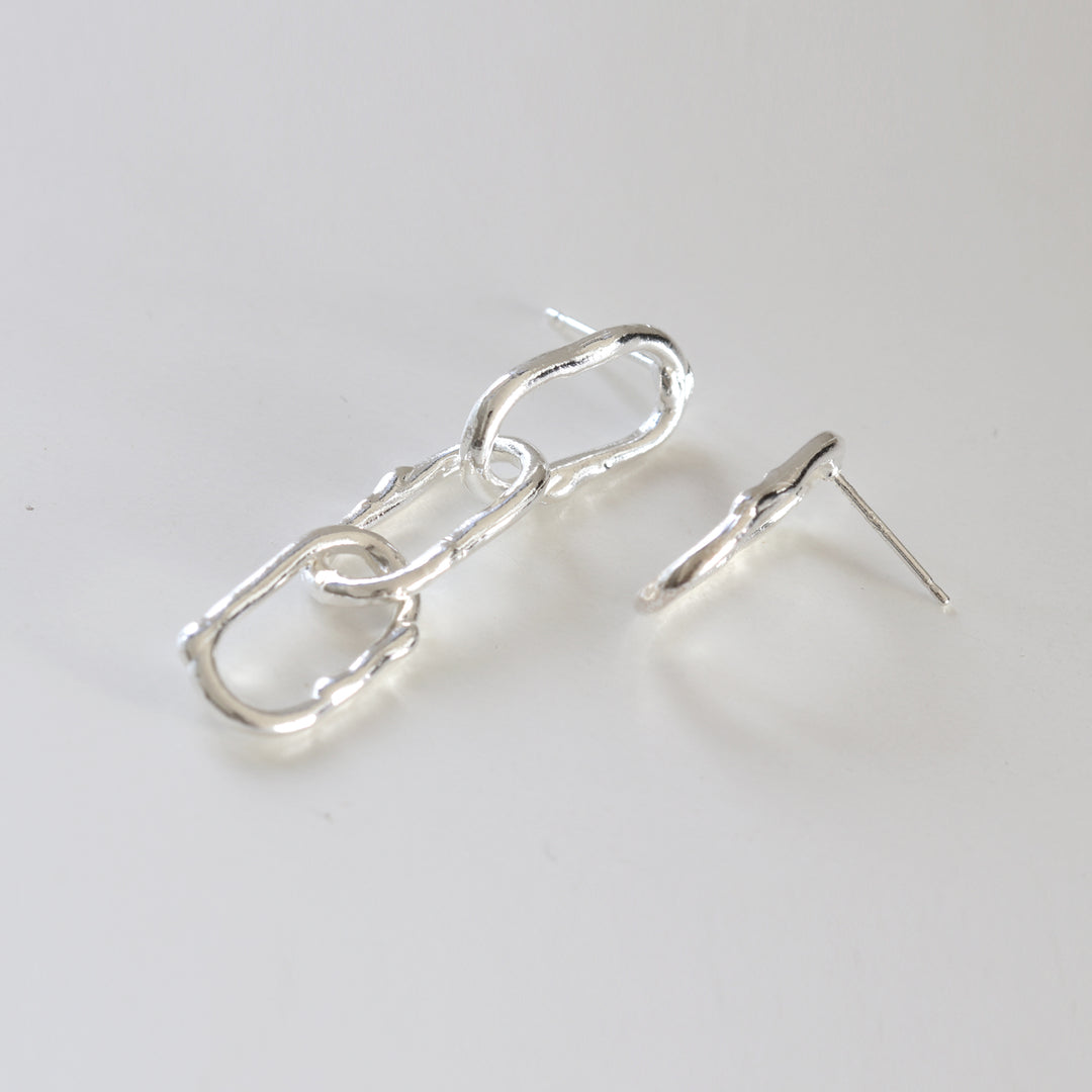 These unique silver earrings feature an unbalanced, linked chain design. One earring showcases three organically shaped, interconnected links that dangle elegantly, while the other earring presents a single, matching link. The handcrafted, textured finish adds a modern, edgy touch, making these earrings a bold statement piece.