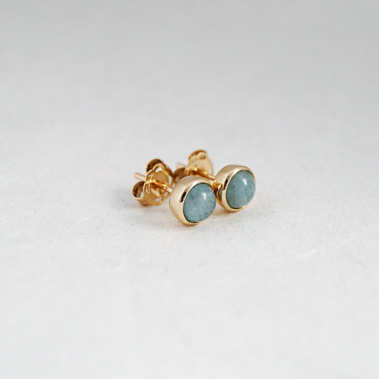 These earrings feature a 6mm cabochon cut aquamarine stone set in 9K yellow gold and complements the Aquamarine Ring.