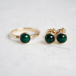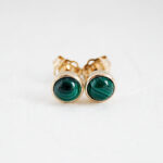 These stud earrings feature a 6mm cabochon cut malachite stone set in 9K yellow gold and complements the Malachite Ring.