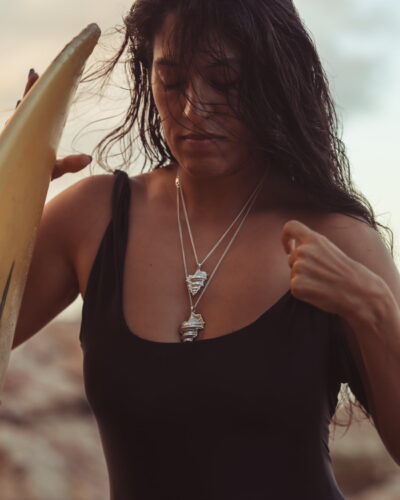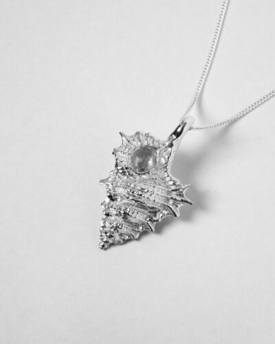 This pendant features the Phasianotrochus irisodontes or rainbow kelp shell, which is found along the rugged coastline of Tasmania.
