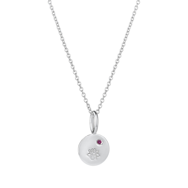 Handmade in a country side workshop in Western Australia. This collection is made in sterling silver stamped with a birthflower and set with a natural birthstone. The disc is 9mm and set on a sterling silver chain.